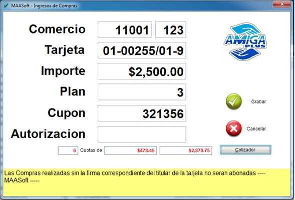 Control o Chequeo de Cupones (Con esta función se hace el chequeo de los cupones presentados por el comercio y en el mismo acto crea las cuotas a liquidar a cada socio según el plan seleccionado)