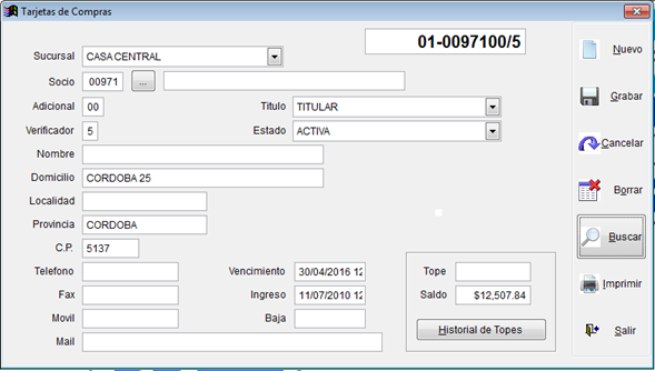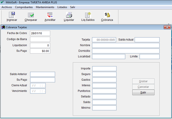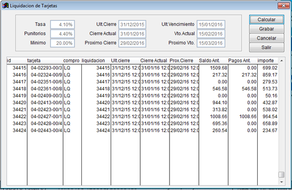 Existe una tabla de parámetros (Parametros) donde se cargan todos vencimientos, cierres, tasas y gastos con los que se manejará el sistema. Es necesario tener mucho cuidado al ingresar o modificar estos datos ya que de ellos dependerá el buen funcionamiento del sistema. El cambio de estos datos (fechas de vencimientos principalmente) solo se realiza una vez al mes inmediatamente después de realizar la liquidación de todas las tarjetas.