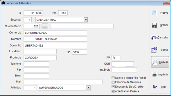Comercios (Nº de Comercio y todos los datos personales e impositivos del Comercio Adherido)