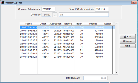 Los cupones recibidos de los comercios se pueden procesar o tildando como pasados (procesar cupones de comercios) a medida que estos los van entregando a la entidad o bien se les puede dar una fecha en la semana (viernes) donde se reciben todos los cupones de cada comerciante.